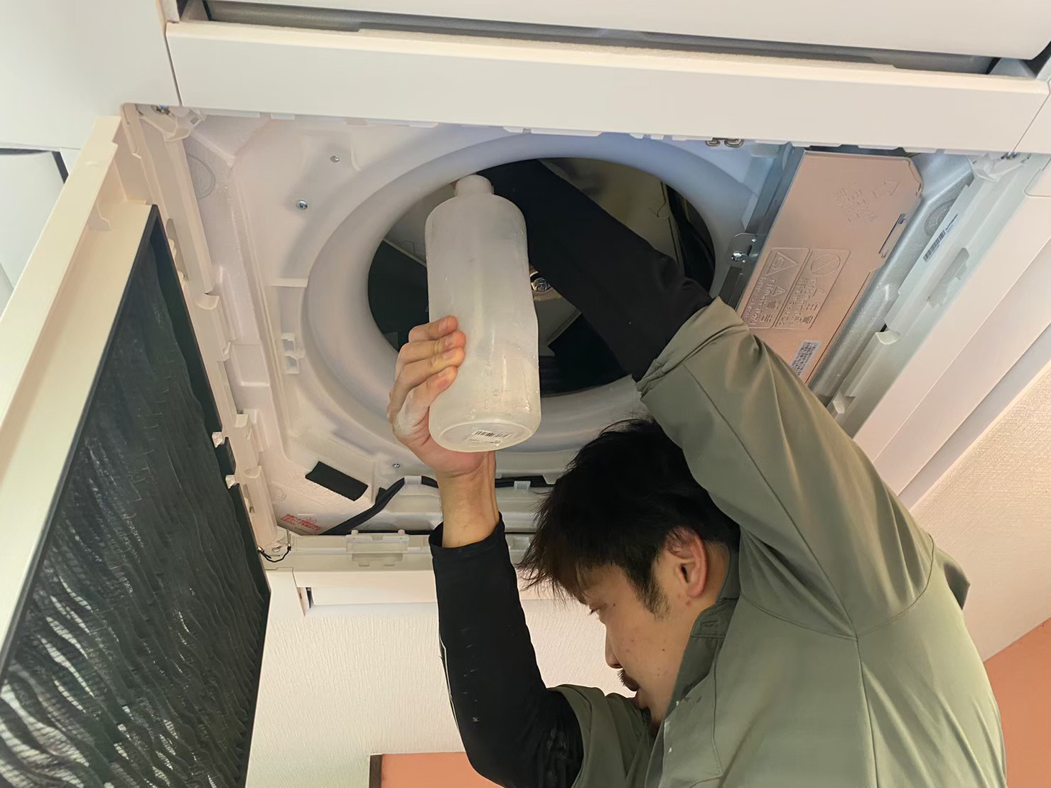ドレン(結露水)は本来夏場しか発生しないので、人為的にドレンを発生させて問題なく排出されるかをチェックしています。