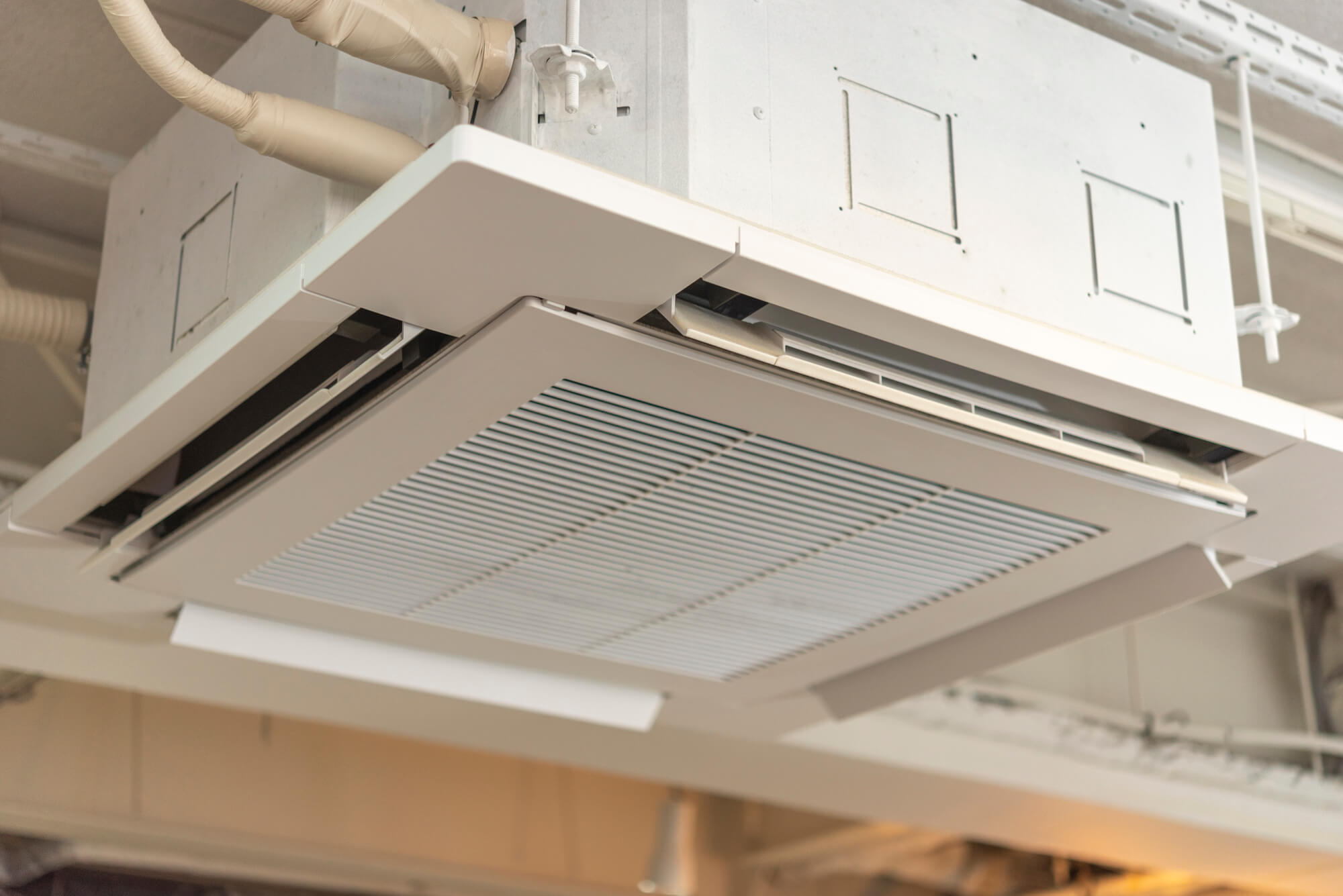 工事のきっかけ 東京都大田区にある某事務所様より、「空調の効きが悪く、異音も気になる」とのご相談をいただきました。既存機器はナショナル製の天井カセット形(四方向)空調機で、長年ご使用されていたこともあり、経年劣化による性能低下が見られました。省エネ性や快適性の向上も踏まえ、
